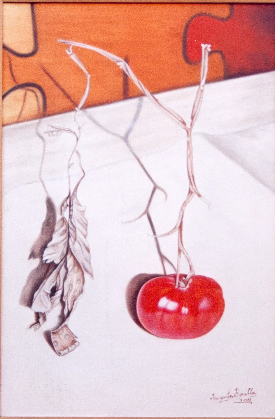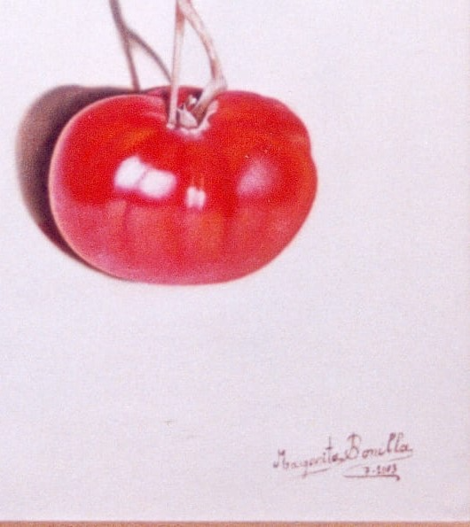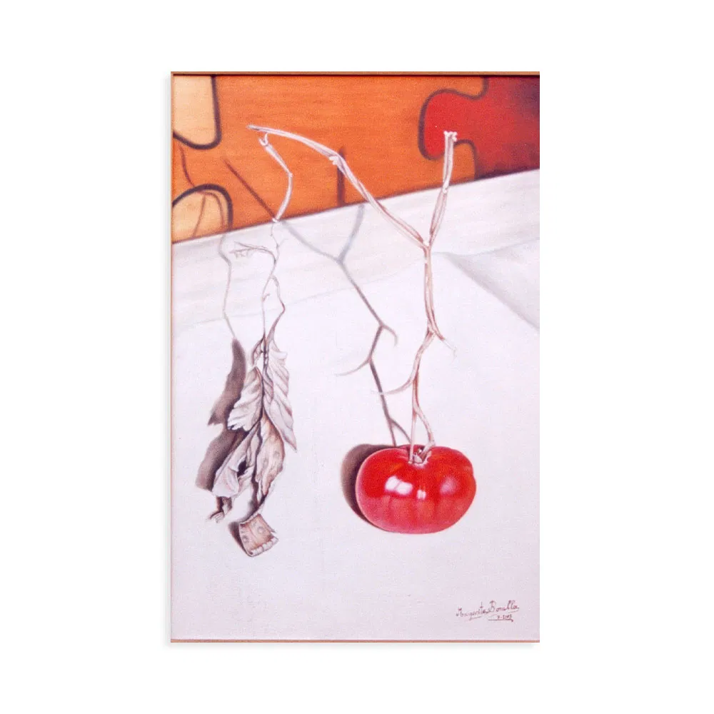 DESCRIPCIÓN: Apenas un tomatito crecido en una maceta sirvió de modelo para esta obra, simplemente apoyado sobre un papel. La primera obra de este estilo. Así arrancamos para no parar jamás.