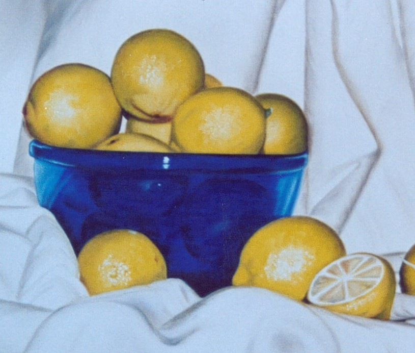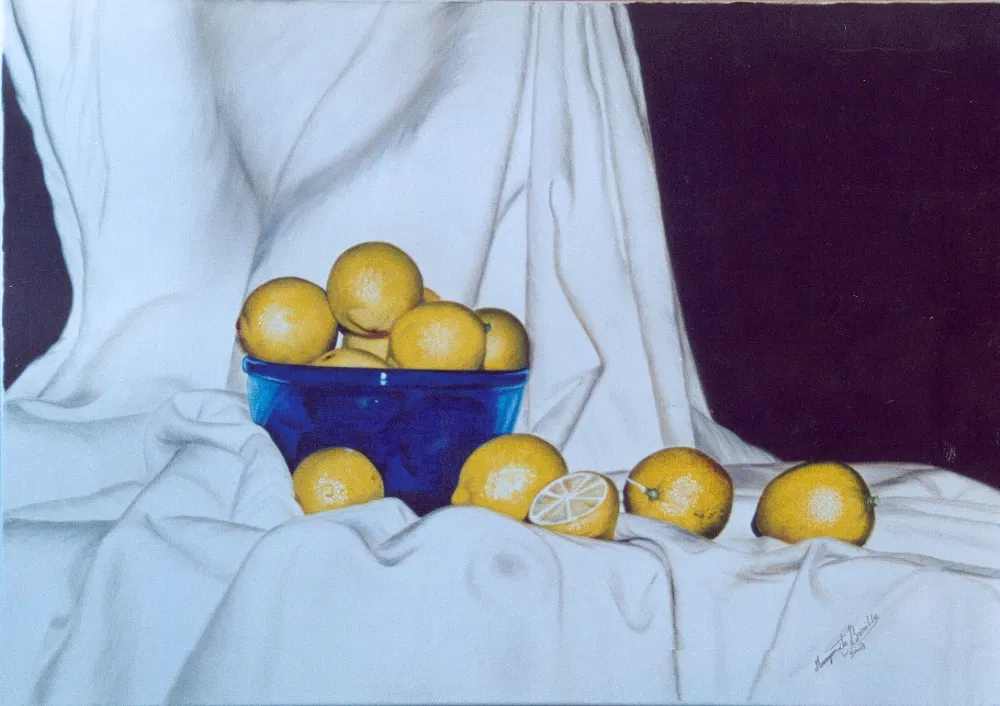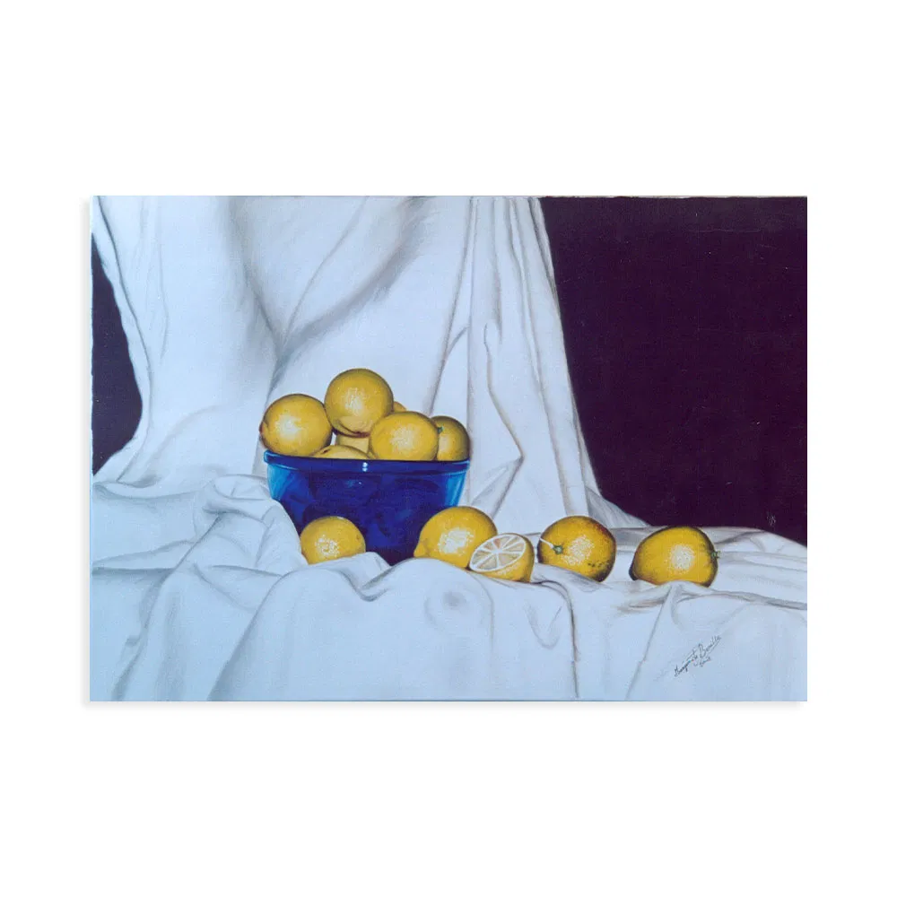 Naturaleza muerta realizada con tela ,limones y una fuente de cristal azul.
