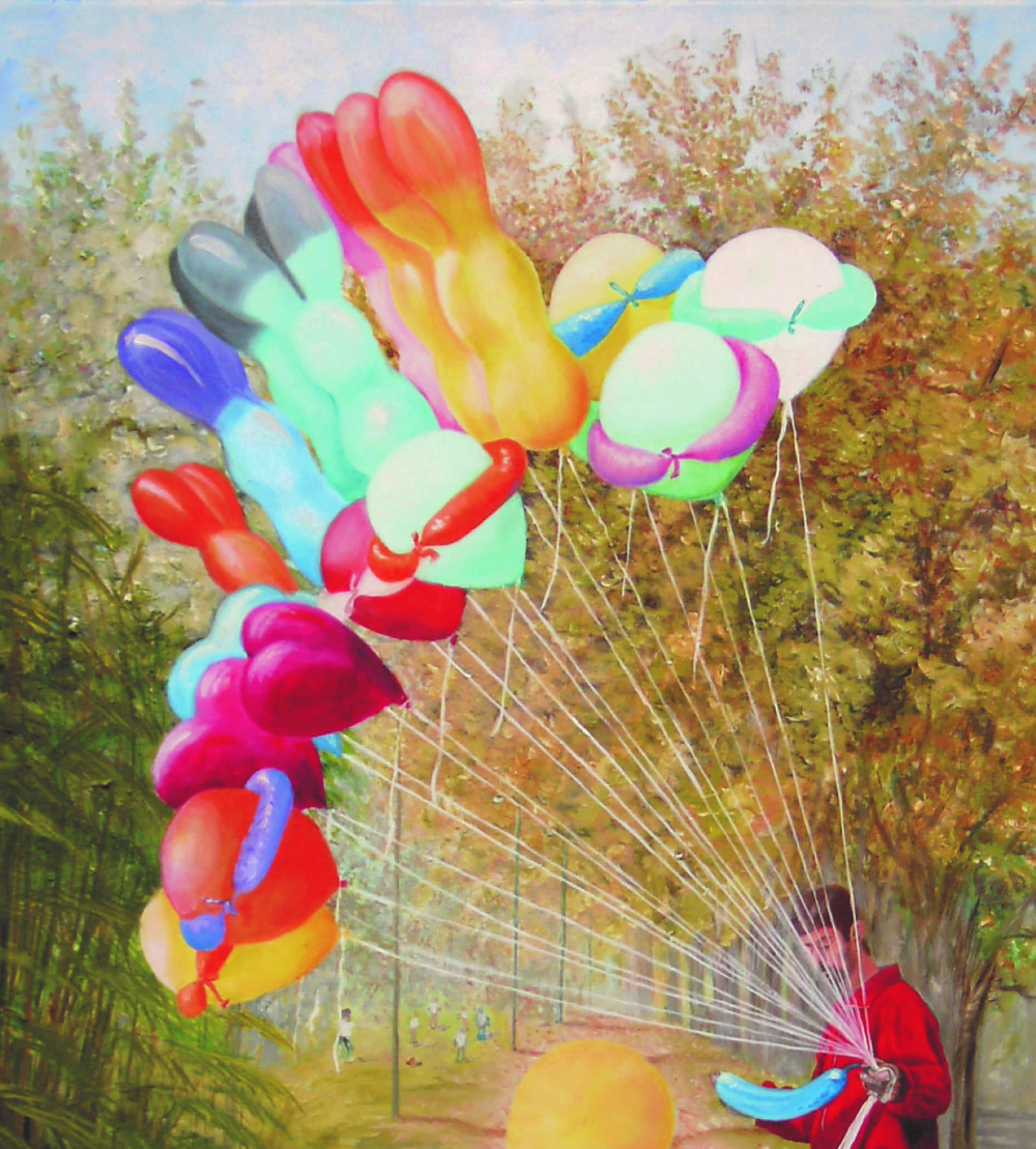 DESCRIPCIÓN: Composición realizada con varios elementos extraídos de distintas fotos que he tomado por ahí. Una plaza imaginaria, mi bicicleta, el globero de la plaza de San Vicente, el banco de mi Mamá ,la nena de un encuentro coral, y, así se armó esta obra.