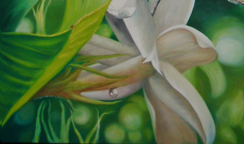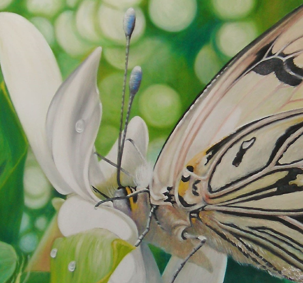 DESCRIPCIÓN: Pintura que hice en base a fotos que le saque a esta mariposa “LECHERITA” que estaba libando en una flor de jazmín que tenía enredado en la terraza.