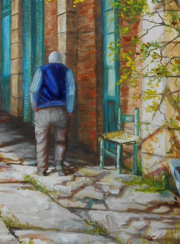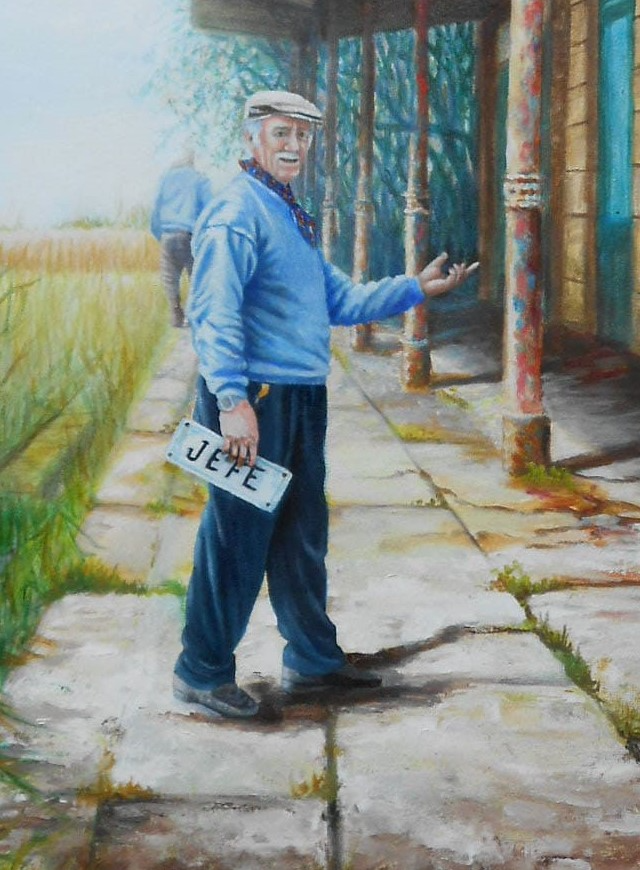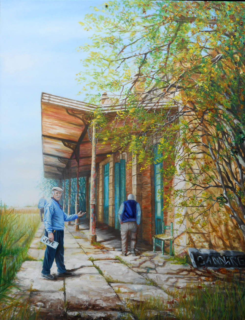 Fui a conocer la estación de trenes que estaba abandonada en CANNING, hace unos años , me encontré con el Sr. DON BENITO ,quien había sido el último jefe que tuvo la estación, y, le habían permitido quedarse a vivir allí para cuidarla. Fue muy muy amable a contarme su historia, por eso pinté este cuadro. Tengo que pintarlo otra vez porque fue muy enriquecedora su historia.