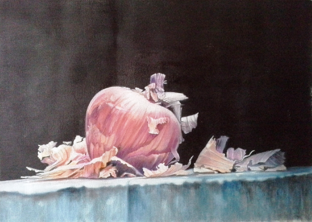 Una composición simple, una cebolla colorada sobre una madera. Me encanta realizarla.
