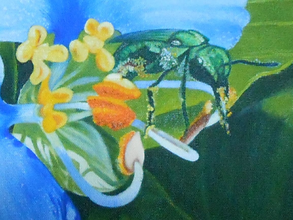 Yo la tengo en macetas y su florcita me atrae al igual que a su polinizador que está muy contento con su polen.