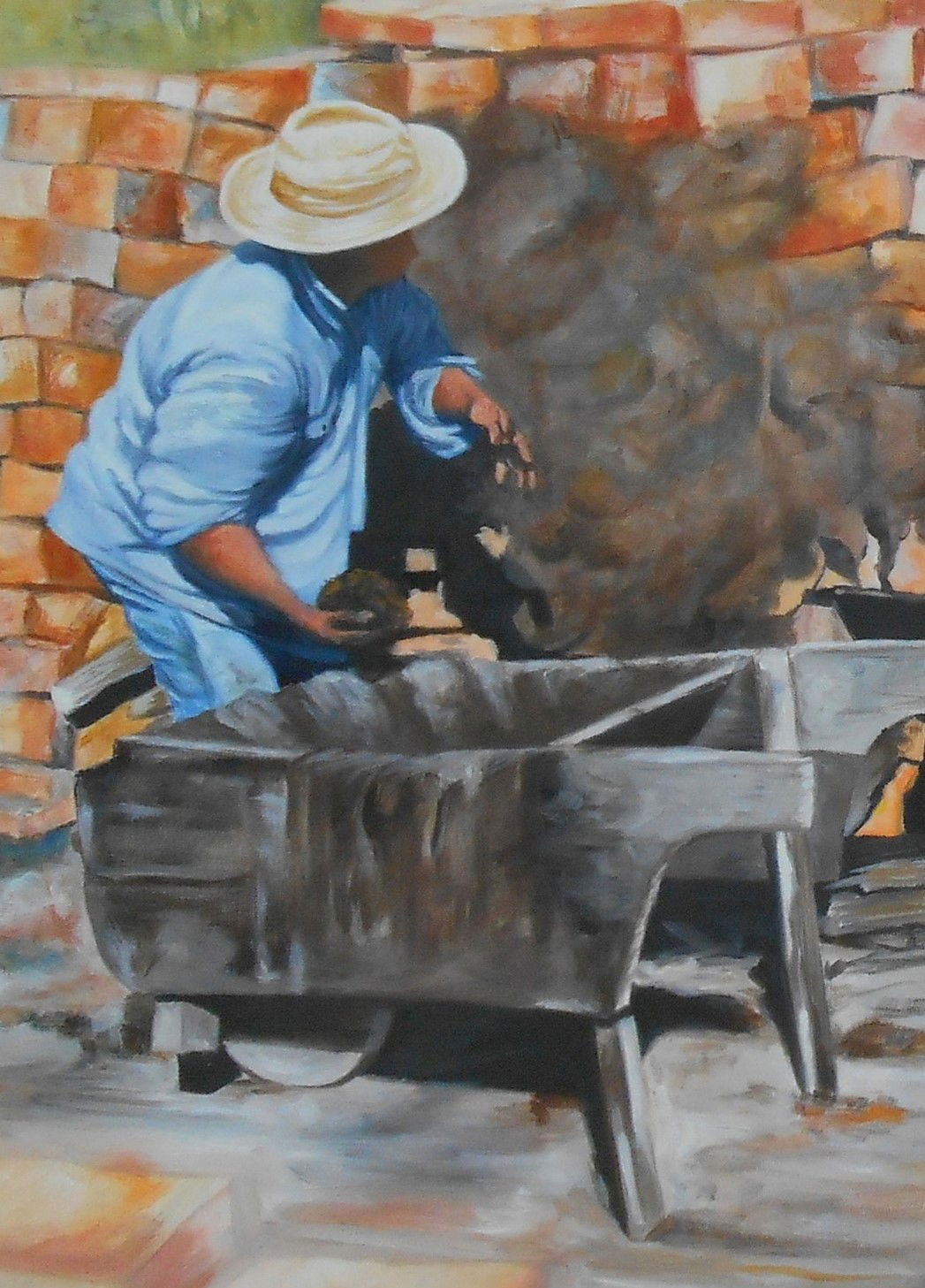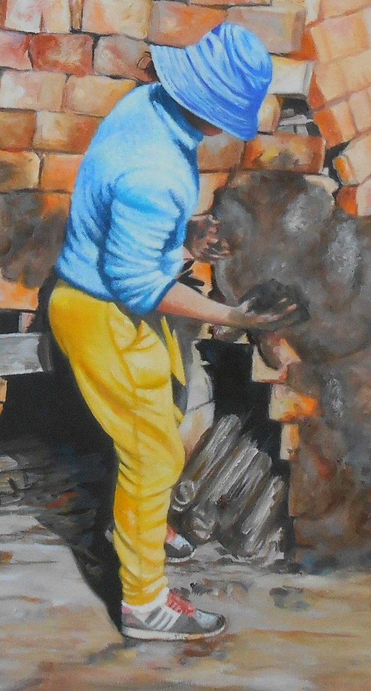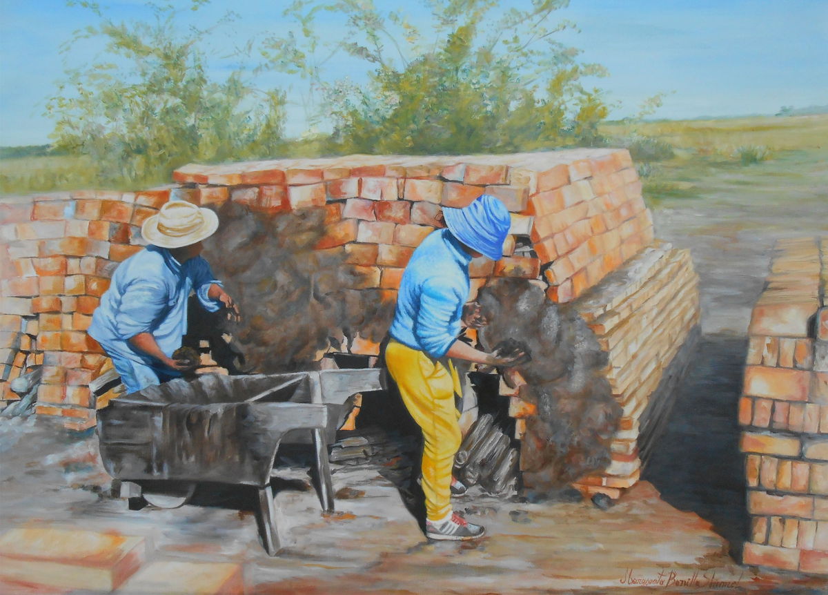 EN BASE A UNAS FOTOS ENVIADAS DESDE CHACO, HE PINTADO A ESTAS PERSONAS TRABAJANDO EN LADRILLOS, FABRICANDO .EN LA ESCENA SE PUEDE APRECIAR COMO ESTAN ARMANDO EL HORNO ,PONIENDO LEÑA Y FORRANDOLO CON BARRO PARA LUEGO PRENDERLO Y ASI COCINAR LOS MISMOS.