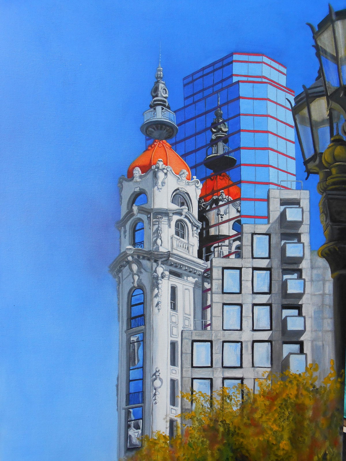 UNA TORRE HERMOSISIMA QUE SE ASOMA DETRAS DEL TEATRO COLON IMPONENTE. SE ASOMA DESDE LA AVENIDA 9 DE JULIO . ME DIO GANAS DE PINTARLA , YA QUE CADA VEZ QUE LA VEO ME LLAMA.