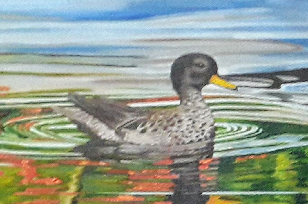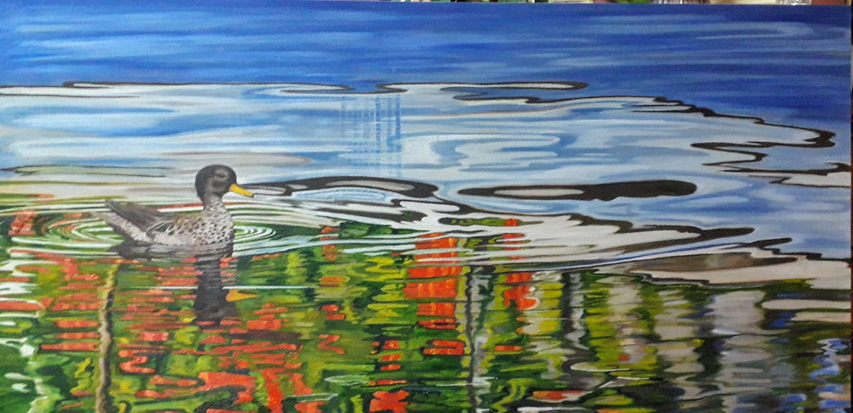 UNA MARAVILLOSA IMAGEN QUE TENIA QUE PINTAR!!! UN PATO BARSINO SALVAJE BAÑANDOSE UNA MAÑANA MUY TEMPRANO EN LA PILETA DE NATACION. COMO NO PINTARLO.