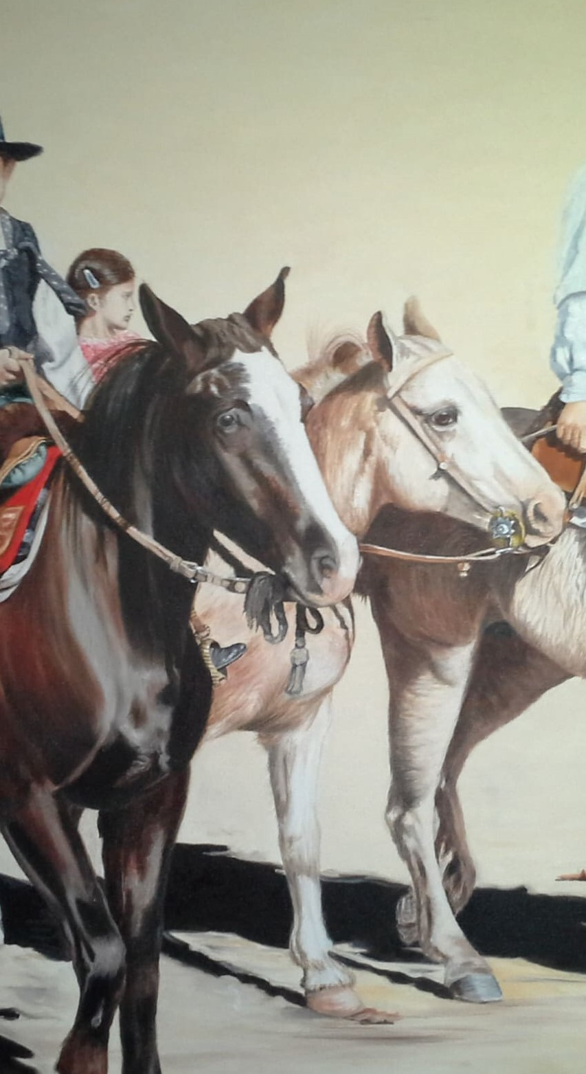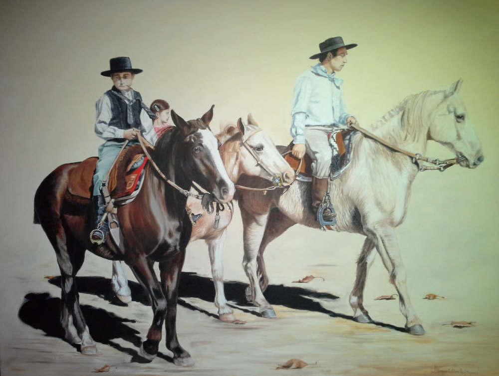 Obra que pinté en base a fotos que saco en los desfiles de SAN VICENTE que se realizan allí los 25 de Mayo. Estas personas eran toda una familia, hermosamente vestidos .