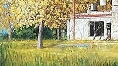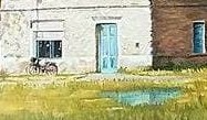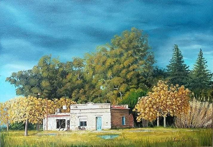 DESCRIPCION: En una visita al pueblo de VILLANUEVA , a la estacion de tren abandonada, nos toco un dia de lluvia, la recorrimos, y, cuando nos volviamos , las nuves se corrieron y me mostraron esa almacen de campo que estaba del otro lado del campo ,iluminada por los rayos del sol. De esa imagen salio esta pintura.