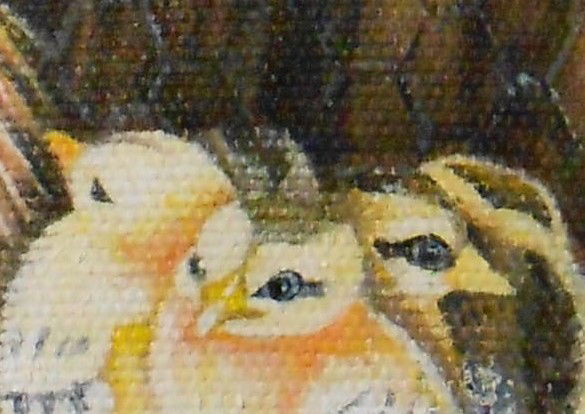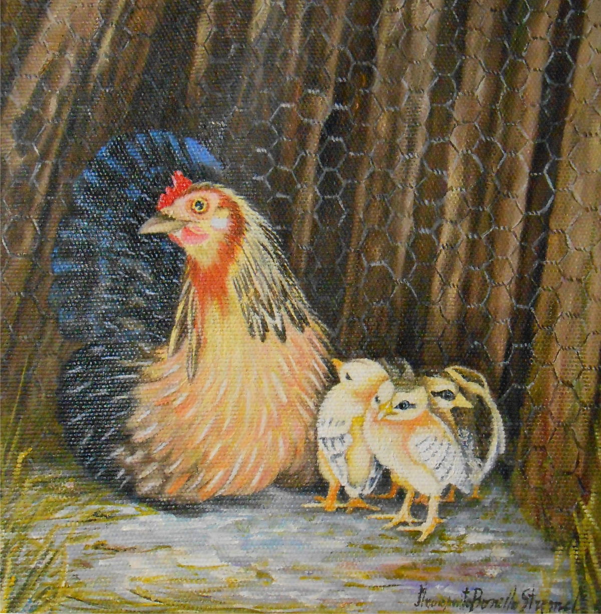 DESCRIPCION:UNA CALLINITA CON SUS POLLUELOSPINTADA AL OLEO.