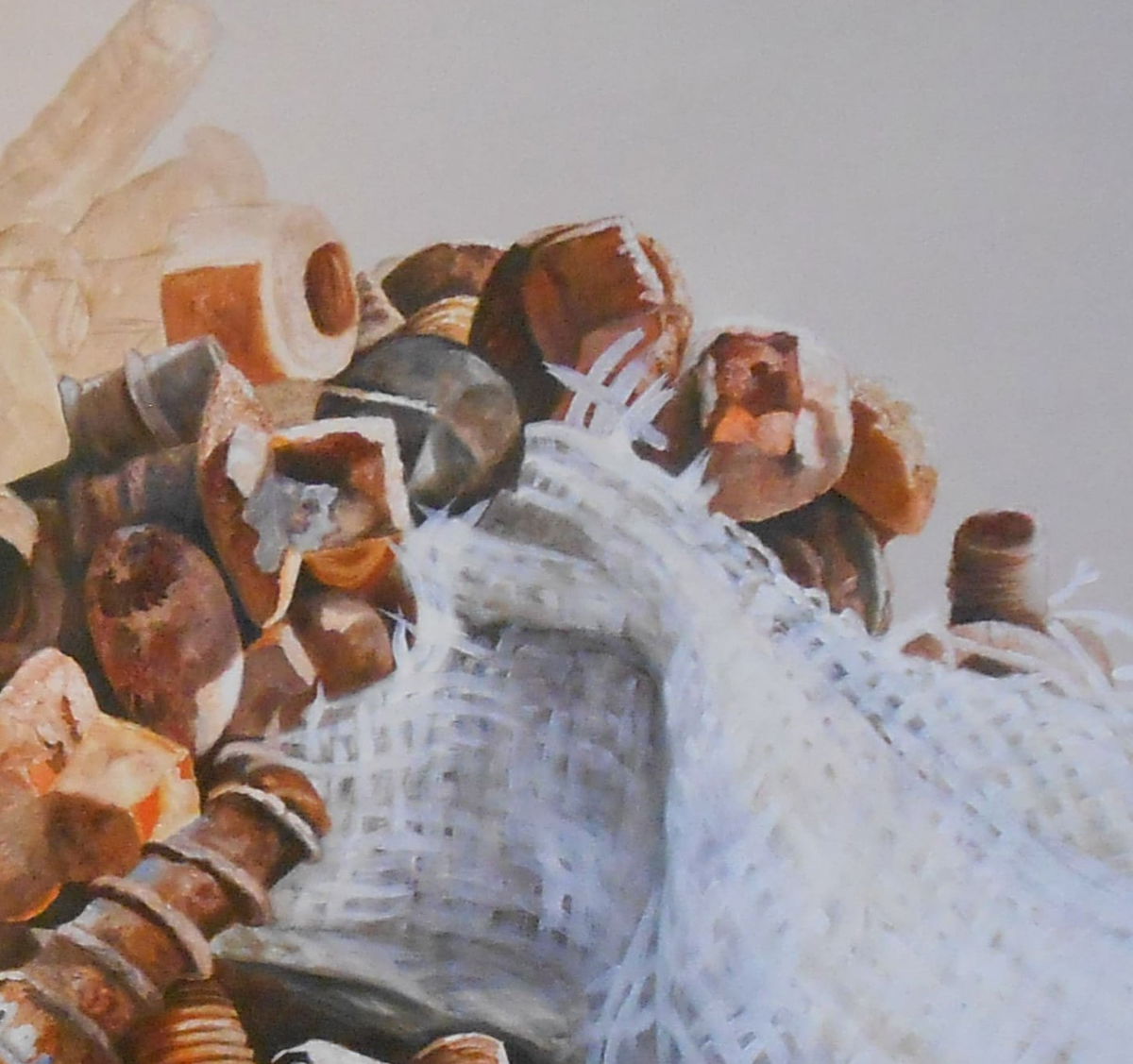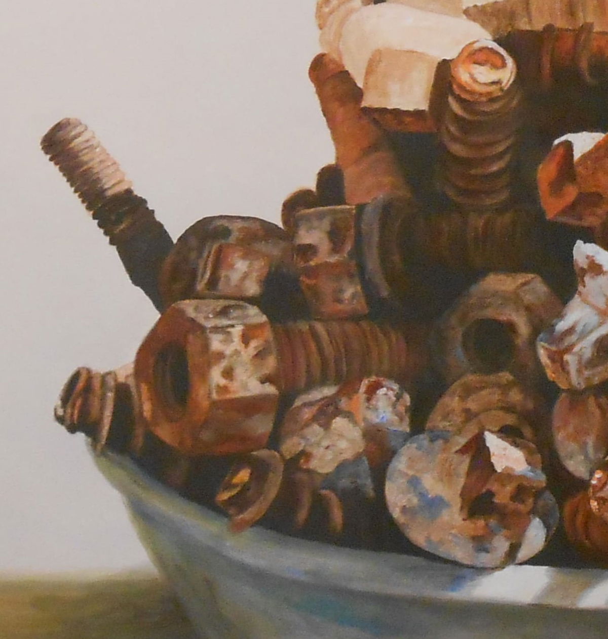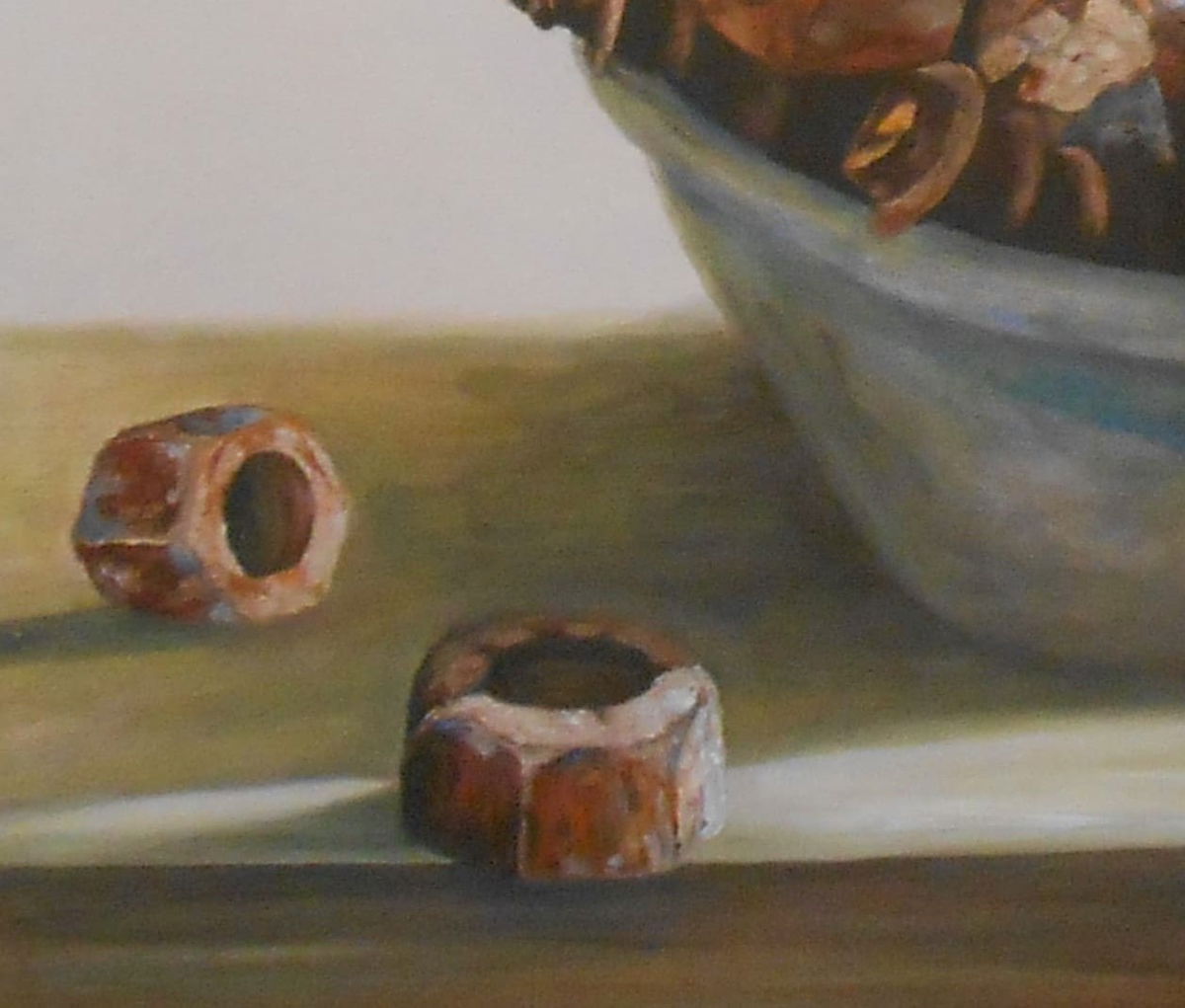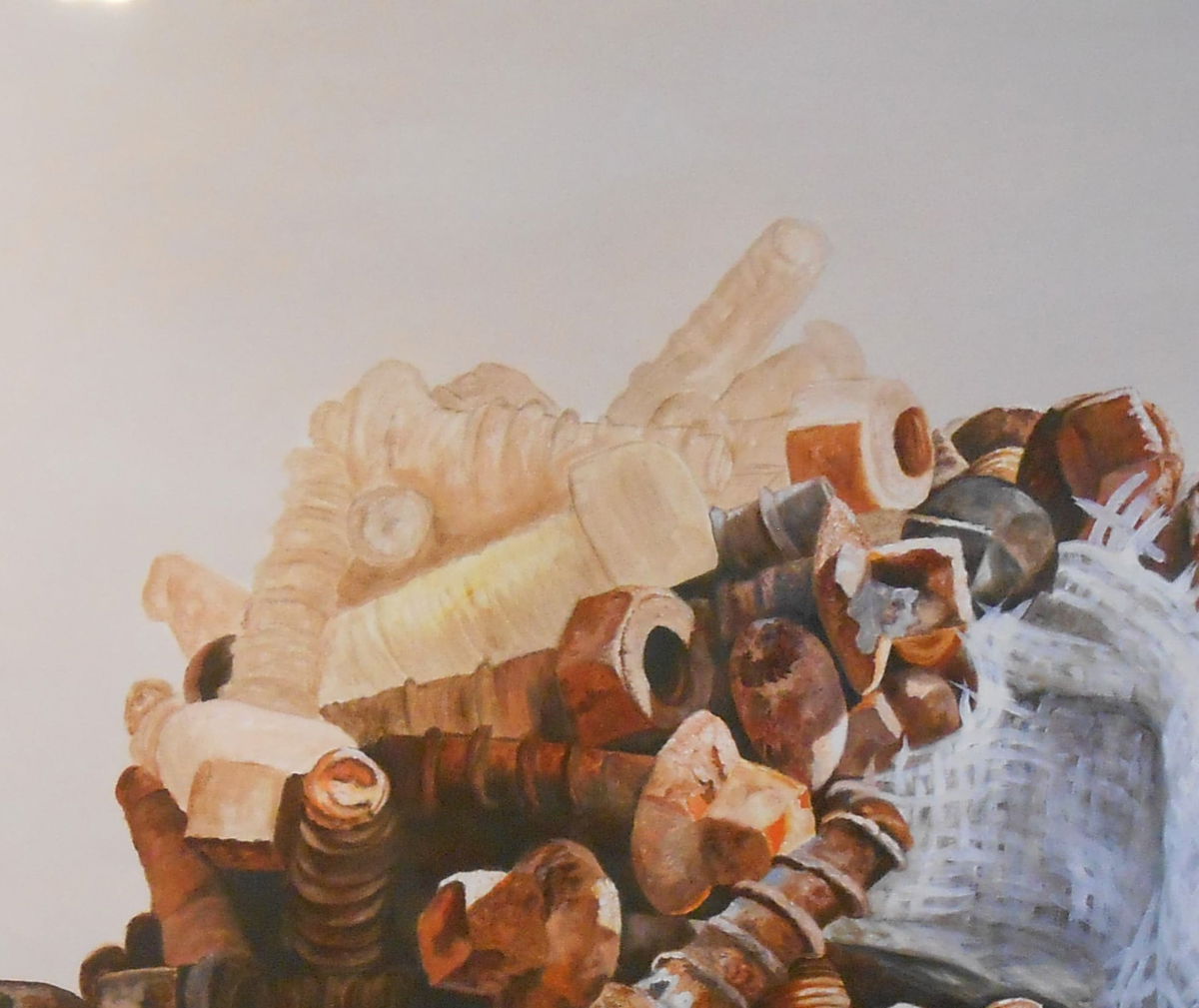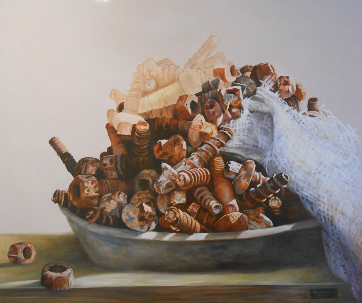 EL DESUSO DE LOS TORNILLOS DE FERROCARRIL MARCADOS POR EL TIEMPO SE HAN TRANSFORMADO EN UNA NATURALEZA MUERTA. ESTA OBRA REPRESENTA EL VOLVER A EMPEZAR.