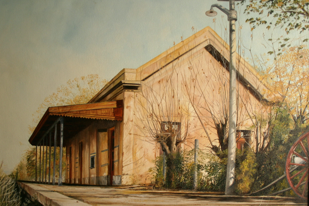 DESCRIPCIÓN: EN UNO DE MIS VIAJES A Merlo (San Luis), me llevaron a conocer el pueblo de Santa Rosa, y, por supuesto, quise conocer su estación. Lamentablemente estaba tomada, de manera que no pude llegar muy cerca, pero lo suficiente para sacar muchas fotos, entre las cuales después pinte esta obra.
