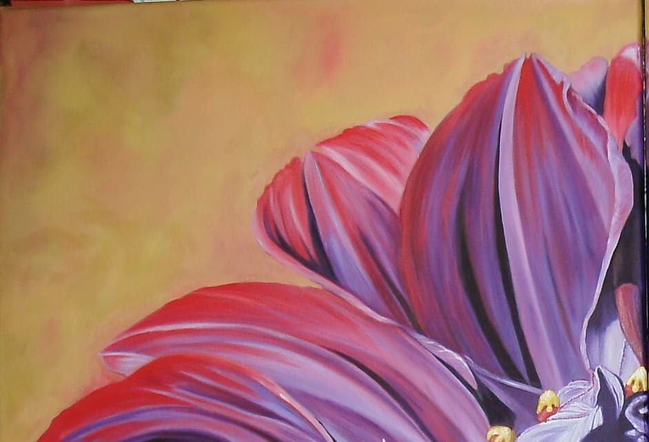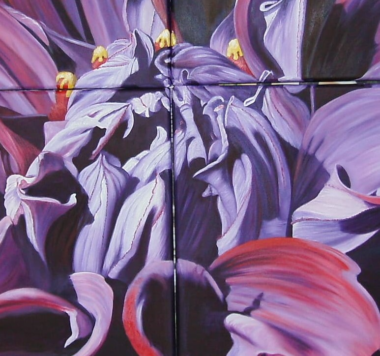 Obra pintada porque mi amiga Raquel tiene muchas plantas hermosas. En una oportunidad le saco fotos a sus flores y resulta que eran flores de DALÍAS unas flores que a mi Mamá le encantaban,son flores hermosas.Las hay de varios colores, ella tenía este color que parecía de terciopelo.